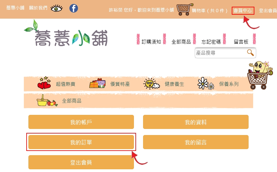 步驟二︰點選會員中心,再選我的訂單