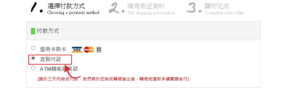 步驟一︰選購完商品後,進入結帳流程至選擇付款方式步驟